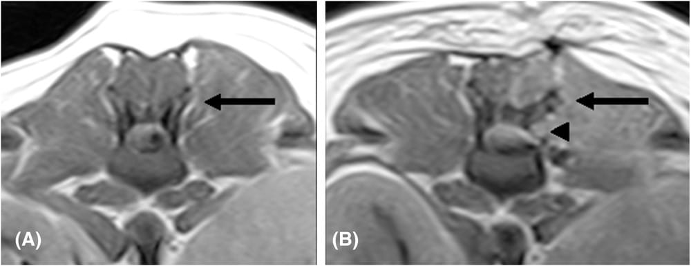 T1W transverse images of the same patient (case 17), pre-operative (A), and postoperative (B). The arrow points to the ventrally displaced left cranial articular process following left-sided mini-hemilaminectomy. A small bony defect in the left lamina of the vertebra is visible ventral to the affected articular process (arrowhead). Acquisition parameters: TR 950 (A and B) ms; TE 26 (A and B) ms; slice thickness 4 mm; slice gap 4 mm; 0.25T MRI