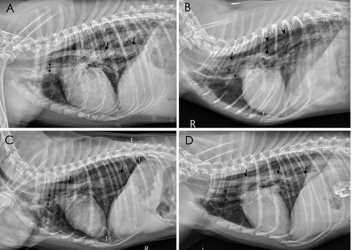 Right (A, B, C) and left (D) lateral thoracic radiographs of Dogs 3, 4, 6, 7, respectively, showing pneumomediastinum. The adventitial surface of the trachea, esophagus (arrowheads), and cranial mediastinal vessels (✽) are visible due to the presence of gas in the mediastinum (A-D). The azygos veins (arrow heads) are also visible (B). Mild pneumothorax († in B, C) and subcutaneous emphysema (‡ in C) were observed.