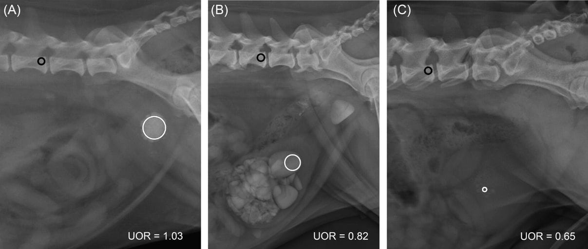Measurements of the ratio (labeled UOR) of the mean pixel value (MPV) of the largest cystolith to the L5 MPV on lateral abdominal radiographs in three dogs. A circular ROI is positioned at the caudal third of L5 vertebra (black circle) with care to avoid superimposition with cortical bone and vertebral transverse processes, and a circular ROI is placed on the largest cystolith (white circle) with care to incorporate as much of the urolith as possible without including its peripheral margins and to avoid superimposition with other uroliths, digestive structures and potential bubbles of gas due to prior catheterization. (A) Bosselated calcium oxalate cystolith in a dog. The MPV of urolith is 2015; the MPV of L5 is 1952; the UOR value is 1.03. (B) Large pyramidal struvite cystoliths and one similar urethrolith in a dog. The MPV of urolith is 1542; The MPV of L5 is 1875; The UOR value is 0.82. (C) Multiple small faceted cystine cystoliths in a dog. The MPV of urolith is 1253; The MPV of L5 is 1914; The UOR value is 0.65.