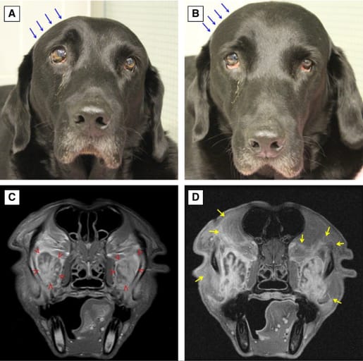 Clinical presentation and magnetic resonance imaging (MRI) findings of an 8-year-3-month-old male neutered Labrador retriever (Case 1) diagnosed with bilateral zygomatic sialadenitis: (A, B) Frontal views. Note the soft tissue swelling overlying the right temporal and masseter muscles (blue arrows), mild bilateral third eyelid protrusion and dorsolateral deviation of the right globe. (C) T1-weighted (T1W) MRI post-contrast and (D) 3D. SPGR post contrast fat suppression showing bilateral swollen and hyperintense zygomatic glands (red arrowheads) with rounded margins, and heterogenous contrast enhancement (arborizing pattern). Patchy contrast enhancement is also appreciated on the bordering fascial planes of the temporal and masseter muscles (yellow arrows).