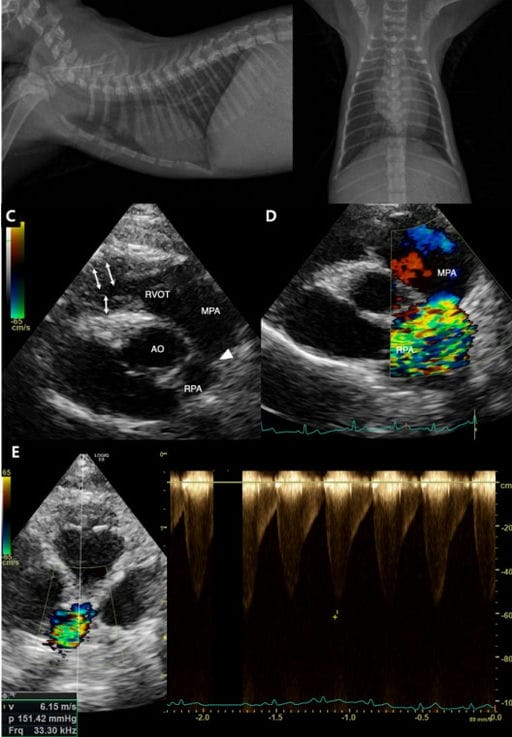 evidence of right ventricular hypertrophy (white arrows), dilation of the MPA, a stenotic RPA, and post-stenotic dilation.