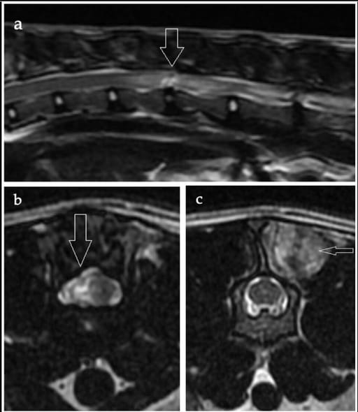 (a) Sagittal T2-weighted image of the thoracolumbar vertebral column, (b) transverse T2-weighted image at the level of the T13–L1 intervertebral disc space, and (c) transverse T2-weighted image at the level of the L2 vertebral body of a domestic shorthair cat aged 3 years 5 months. (a) A linear hypointense tract extends from the T13–L1 intervertebral disc into the spinal cord parenchyma, surrounded by an ill-defined hyperintense area (arrow). The T13–L1 nucleus pulposus shows a reduced volume compared with the adjacent discs. (b) Right-sided intramedullary changes are evident at the level of the T13–L1 intervertebral disc (arrow), with no apparent extraneous material in the epidural space. (c) A relatively well-demarcated hyperintensity within the epaxial musculature at the level of the L2 vertebral body, suggestive of epaxial muscle contusion or oedema (not haemorrhage, based on excluded T2*-weighted gradient-recall echo images), was considered potentially indicative of external trauma or secondary to the extrusion (arrow)