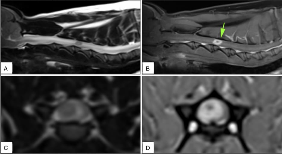 Sagittal T2-weighted image (A), sagittal T1-weighted post-contrast image (B), transverse T2-weighted image (C) and transverse T1-weighted post-contrast image (D). The lesion can be seen as a focal rounded intramedullary abnormality with marked perilesional T2-weighted hyperintensity and ring contrast enhancement (arrow). All images were obtained with 1.5 T MRI.