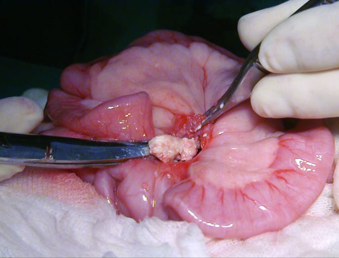 Case 1: Mesenteric lymph node undergoing debridement during first exploratory laparotomy