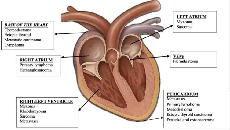 Cardiac tumors in dogs are being diagnosed more frequently as imaging technologies evolve. Although echocardiography remains the cornerstone of diagnosis, CT, MRI, and advanced imaging refine evaluation and staging. Right atrial hemangiosarcoma and chemodectoma represent the most important entities, with significant clinical implications. Treatment strategies are primarily palliative, aimed at symptom relief and modest survival extension, as curative interventions are rarely possible. Early recognition and a multimodal diagnostic approach are essential for optimizing patient outcomes.
