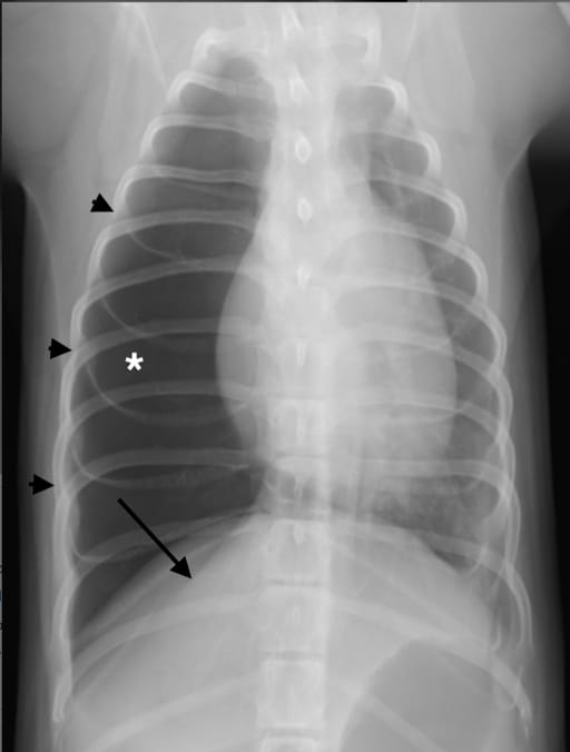 Dorsoventral radiograph of the thorax of a dog with congenital lobar emphysema (CLE) of the right middle lung lobe. Note the enlarged and hyperlucent lung lobe (*), expanded right side of the rib cage (black arrowheads) and compressed right diaphragmatic crus (black arrow). It was not possible to determine which lobe was emphysematous based on the radiographs alone