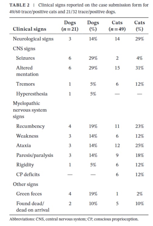 Submissions rose 2.8-fold from 59 (2010–2016) to 164 (2017–2023). Cats were significantly younger than dogs (median 24 vs. 36 months) and more likely to test positive for DMB (43% vs. 14%; p < 0.0001). Adipose tissue was the most sensitive diagnostic sample. Clinical signs varied: dogs often exhibited seizures and altered mentation, consistent with a “convulsant syndrome,” while cats more frequently showed ataxia and paresis, aligning with a “paralytic syndrome.” MRI findings in 13 of 17 cases (77%) showed changes consistent with bromethalin-induced leukoencephalopathy. Autopsies confirmed CNS white matter damage in most cats but less consistently in dogs. Notably, bromethalin was also detected in milk in one case, raising concerns for lactational transmission.
