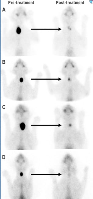 Thyroid scintigraphy in four cats with unilateral thyroid nodules, before and after treatment with 131I. (A) Reduction in size and radionuclide uptake of the “hot” right-sided thyroid nodule, with recovery of the previously suppressed left thyroid lobe; (B) Complete ablation of unilateral left thyroid nodule, with recovery of the contralateral right lobe; (C) Reduction in size and uptake intensity of the left thyroid nodule, but the contralateral right lobe remains suppressed. (D) Complete ablation of both the hot nodule and normal contralateral lobe