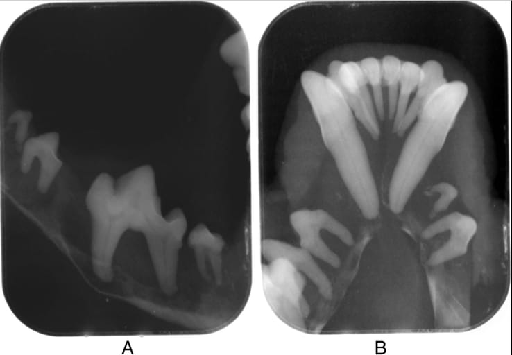 Case 2. Intraoral radiographs showing severe osteopenia, loss of lamina dura, interradicular and interdental bone, thin mandibular cortex with no uniform density. (A) Lateral left first molar and mandible. (B) Ventrodorsal view of rostral mandible.