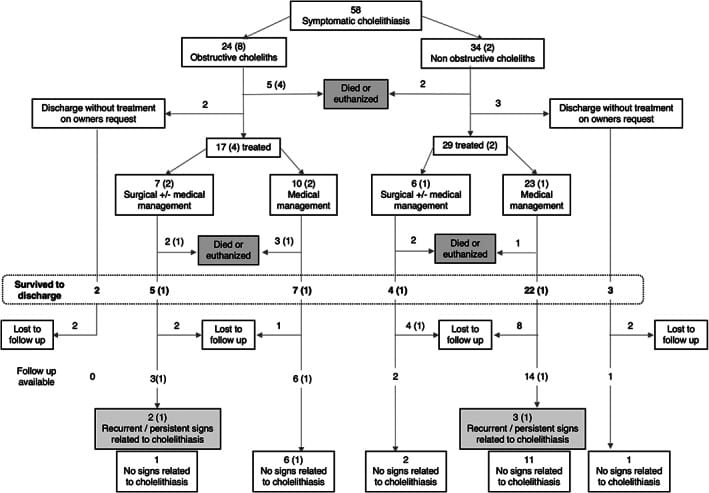 Conclusions: Cholelithiasis is uncommon and can be asymptomatic in cats. Symptomatic cholelithiasis frequently is associated with another hepatobiliary disease or biliary tract obstruction or both. Biliary tract obstruction is associated with poorer outcome. Medical treatment can be successful in selected cases. Incidental cholelithiasis rarely progresses to symptomatic cholelithiasis.