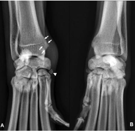 Fig. 2. Comparative radiographs of the carpus, 8-year-old male GoldenRetriever, agility training. (A) Right carpus, dorsopalmar view. The distalradial groove is radiolucent with radiopaque contours (arrows). Soft tissueswelling is present medial to the carpus. The sesamoid bone at the abductorpollicis longus insertion is visible (arrowhead). (B) Left carpus, dorsopalmarview. Normal distal radius and carpus.