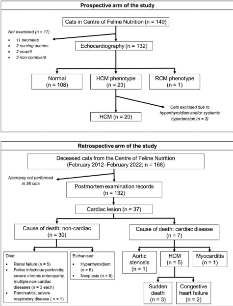 Flow chart summarising the design of a study to evaluate the prevalence of subclinical hypertrophic cardiomyopathy (HCM) and cardiac mortality in a colony of non-purebred cats. HCM = hypertrophic cardiomyopathy; RCM = restrictive cardiomyopathy.