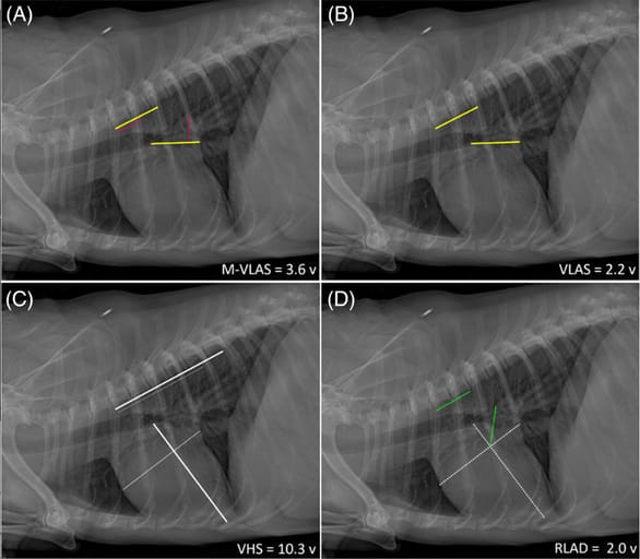 Measurements of M-VLAS, VLAS, VHS, and RLAD demonstrated on the same right lateral inspiratory radiograph of a dog with stage B2 MMVD. All methods take their respective measurements from the cranial edge of the T4 vertebral body extending caudally, parallel to the vertebral column, rounded to the nearest 0.1 vertebrae. A. MVLAS—an initial line (yellow)—is drawn from the centre of the most ventral aspect of the carina to the intersection between the most caudal aspect of the left atrium and the dorsal border of the caudal vena cava. A second additional line (red) is then drawn from the most distal border of the left atrium towards the first line, intersecting it perpendicularly. Two separate straight lines corresponding to the lengths of the first 2 lines (yellow + red) were then drawn from the cranial edge of the T4 vertebral body extending in a caudal direction, ventral and parallel to the vertebral canal. The M-VLAS for this dog is 2.2 + 1.4 = 3.6 vertebrae (v). (Note: the first value being the VLAS.) B. Vertebral left atrial size (VLAS = 2.2v)—yellow line C. Vertebral heart score (VHS = 5.7 + 4.6 = 10.3v), vertical axis—thick white line; horizontal axis—thin white line. D. Radiographic left atrial dimension (RLAD = 2.0v)—dashed white lines represent the VHS vertical and horizontal axes, constituting the foundation for the RLAD measurement (green line), which bisects the VHS intersection.