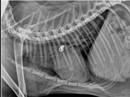 Lateral thoracic radiograph following the procedure and confirming adequate placement and location of the Vet-PDA Occluder™ device.
