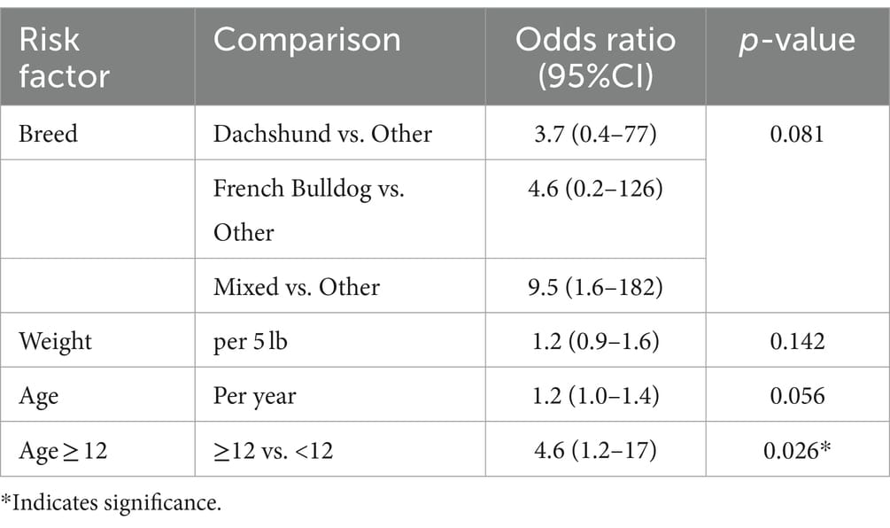 This retrospective study reviewed medical records of dogs presented with presumed acute IVDH at a specialty veterinary hospital between July 2020 and July 2022. Dogs were included if they underwent routine thoracic radiographs prior to advanced spinal imaging as part of a pre-anesthetic screening. The primary variable of interest was the alteration of the treatment plan based on the radiographic findings. Statistical analyses were conducted using Fisher’s exact test and logistic regression.