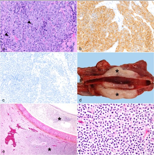 Macroscopic, histological, and immunohistochemical features of tracheal neoplasia in cats. (a–c) Tracheal carcinoma in a 12-year-old, castrated male, domestic shorthair cat. Case 26. (a) The neoplastic polygonal cells are arranged in broad trabeculae and lobules separated by a fibrous stroma with multiple mitotic figures (arrowheads). Hematoxylin and eosin (HE). (b) Neoplastic cells have strong cytoplasmic immunolabeling for cytokeratin AE1/AE3. Cytokeratin AE1/AE3 immunohistochemistry (IHC). (c) Neoplastic cells lack immunolabeling for vimentin. Vimentin IHC. (d–f) Tracheal lymphoma in a 10-year-old, female spayed, domestic longhair cat. Case 42. (d) A 7.1 cm × 4.2 cm × 2.0 cm, infiltrative, pale tan-white, firm, solid neoplasm infiltrates and expands the tracheal wall (asterisks). (e) The submucosa, cartilaginous rings, and adventitia of the trachea are infiltrated and expanded by sheets of neoplastic lymphocytes sustained by fine fibrovascular stroma (asterisks). HE. (f) Neoplastic lymphocytes are large, with scant pale eosinophilic cytoplasm, irregular round nuclei with coarsely to dense chromatin and one prominent nucleolus. HE.