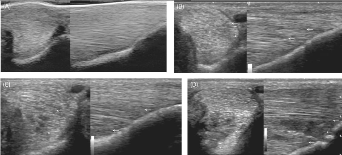 Examples of the grading system for the ultrasonographical appearance of the fibrillar pattern in the insertional region of the equine suspensory ligament branch. (A) Grade 0 fibrillar pattern: Homogenous echogenicity and uninterrupted fibrillar pattern. (B) Grade 1 fibrillar pattern: Regions of mild hypoechogenicity and/or small areas of subtly irregular fibrillar pattern, seen here as an indistinct hypoechoic region in the abaxial portion of the branch. (C) Grade 2 fibrillar pattern: Regions of moderate hypoechogenicity and/or focal areas of mild-moderately disrupted fibrillar pattern. (D) Grade 3 fibrillar pattern: Regions of severe hypoechogenicity/anechoic areas and/or extensive fibrillar disruption, large core lesion(s).
