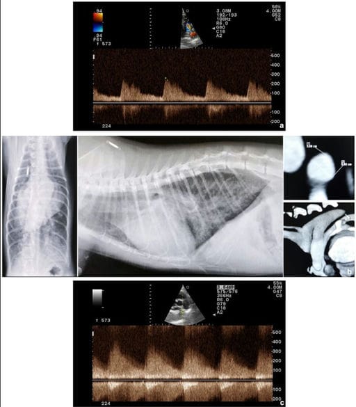 (a) Right parasternal short-axis view of the heart base at the level of pulmonary arteries optimised for spectral Doppler interrogation of ductal flow, demonstrating continuous left-to-right shunting with a reduced velocity through the patent ductus arteriosus (PDA) (unrestrictive pulsatile flow) before surgery in case 1. (b) Thoracic radiography (right lateral and dorsoventral view) and CT showing severe cardiomegaly, increased pulmonary vascular markings, diffuse interstitial-alveolar pattern and a large tubular PDA without any constrictions at its ends, respectively. Notice the prominent main pulmonary artery and leftward bulge of the aorta in thoracic dorsoventral view (case 1). (c) Right parasternal short-axis view of the heart base at the level of pulmonary arteries optimised for spectral Doppler interrogation of pulmonary artery/ductal flow after surgical closure of the PDA in case 1, demonstrating predominantly continuous flow below the baseline throughout the diastole, resembling a ‘sawtooth’ flow pattern suspicious of pulmonary artery branch stenosis and reversed PDA