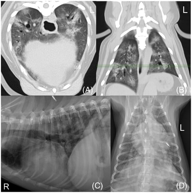 Nine-year-old female, spayed Chihuahua, acute on chronic tachypnea; history stated “suspect PTE”. The imaging and history can be used as an example of major misinterpretation due to framing bias; the imaging also illustrates the challenges of diagnosing ILD, even with the addition of CT. Transverse (A) and dorsal (B) CT images show multifocal unstructured interstitial to alveolar lung pattern that is somewhat wedge-shaped as it extends to the lung periphery. Right lateral (C) and ventrodorsal (D) radiographs show multifocal lung disease as well as enlarged pulmonary arteries caudodorsally. PTE was prioritized for the combination of findings. Histopathologic diagnosis revealed ILD, to include cryptogenic organizing pneumonia and secondary diffuse alveolar damage. Embolic processes were not identified. Image acquisition parameters for CT: standard reconstruction kernel, WW:1500, WL:−600, 2 mm slice thickness. ILD, interstitial lung disease.