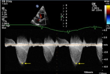 Representative spectral Doppler echocardiographic image taken from a dog with pulmonary valve stenosis, illustrating the modal (‘chin’) velocity method used to identify peak instantaneous transpulmonary velocity in the present study. The yellow ‘+’ and arrow denote modal velocity.