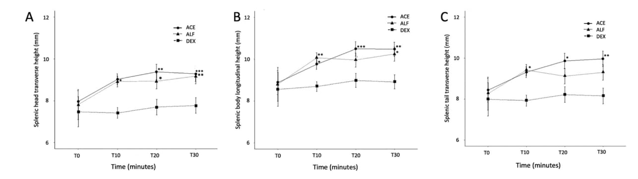 Mean (SE) thickness of the splenic head (a, transverse plane), body (b, sagittal plane) and tail (c, transverse plane) priorto (T0) and 10 (T10), 20 (T20) and 30 (T30) minutes following IM administration of 0.05 mg/kg acepromazine (ACE), 3 mg/kg alfax-alone (ALF) or 10 μg/kg dexmedetomidine (DEX), each in combination with 0.5 mg/kg morphine in cats (n = 8 per group). Aster-isks indicate statistical significance compared to T0: p < 0.05; *p < 0.01; ***p < 0.001.