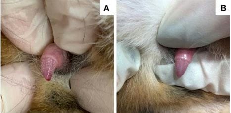 Images of the penis in a 7-year-old neutered male domestic shorthair cat (case 1) that underwent surgical adrenalectomy for a androstenedione-secreting adrenal tumor. Serum androstenedione concentration prior to surgery was 3.2 nmol/L (RI 0.35–2.1 nmol/L), which decreased to 0.35 nmol/L 3 weeks after surgery. (A) Penile barbs are apparent immediately prior to surgery. (B) The penile barbs had substantially regressed 2 weeks post-adrenalectomy.