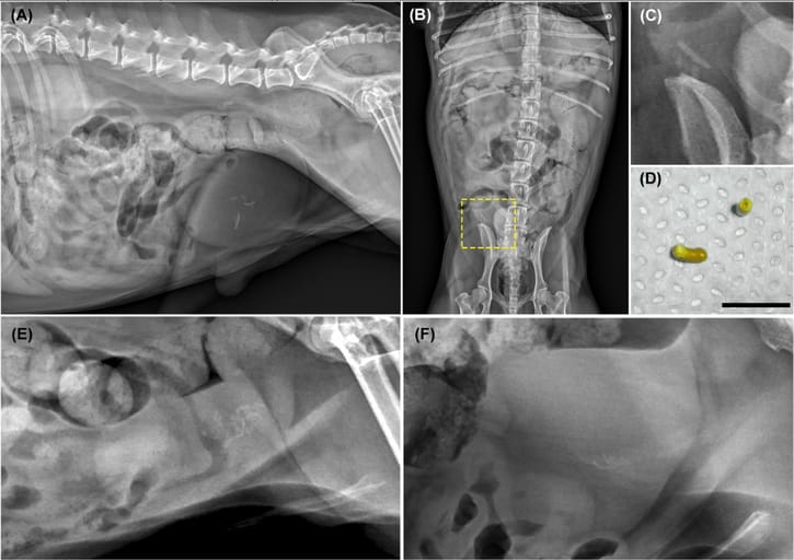 Seven cases were identified, involving six dogs (one dog presented twice). Affected dogs were all neutered males, small breed (3.2–10.7 kg), and middle-aged (mean 9.4 years). Radiographic findings showed multiple linear, mineral-dense calculi located centrally within the bladder. One dog exhibited both round and linear calculi. Gross examination confirmed a hollow core in all cases. Calculi were composed of calcium oxalate. Prior cystotomies had used monofilament absorbable sutures (polydioxanone or poliglecaprone 25), though two cases had unknown suture material. Recurrence time ranged from 3 months to 2 years post-surgery.