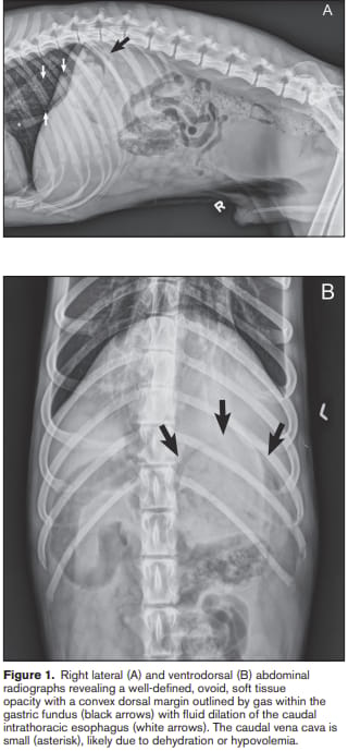 intrathoracic esophagus (white arrows). The caudal vena cava is