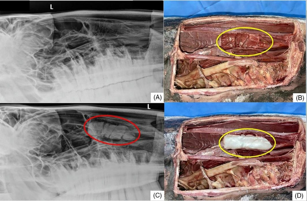 Anatomical and radiographic visualization of the dorsal conchal bullae (DCB). Laterolateral radiographic projection without contrast (A); lateral view of the right DCB after dissection (yellow circle) (B); left laterolateral radiographic projection after contrast (red circle) (C); lateral view of the right DCB after contrast administration (yellow circle) (D).