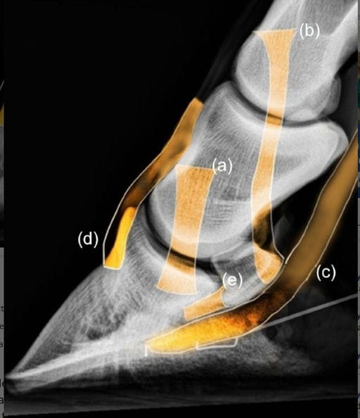 Radiographic guide (lateromedial projection) illustrating the entheses of the collateral ligaments of the distal interphalangeal joint (a); the collateral sesamoidean ligament (b); the deep digital flexor tendon (c); common digital extensor tendon (d); and the distal sesamoidean impar ligament (e).