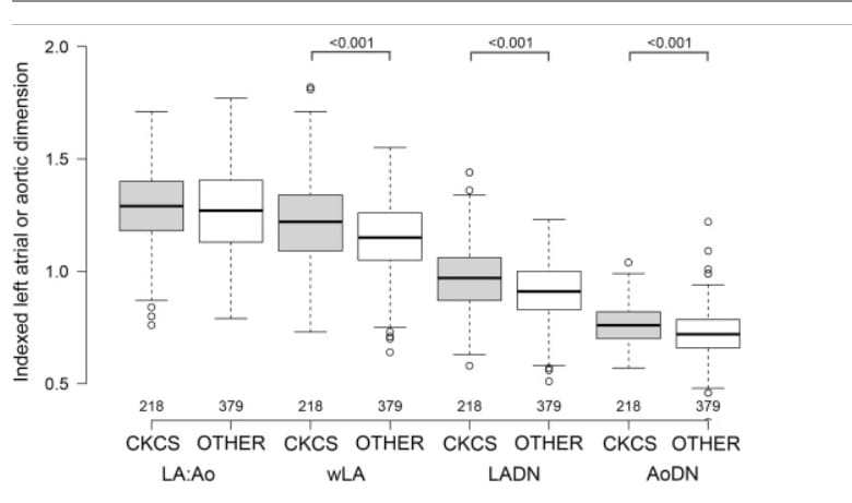 Cavalier King Charles Spaniels (CKCS) are commonly affected by myxomatous mitral valve disease, for which left atrial-to-aortic root ratio (LA:Ao) is an important echocardiographic index used to assess severity. Prior reports suggested CKCS may have smaller LA:Ao values than other breeds, potentially requiring breed-specific reference limits. This study aimed to determine whether LA:Ao and other normalized cardiac dimensions differ in healthy CKCS compared to dogs of other breeds, and whether existing reference intervals are applicable.