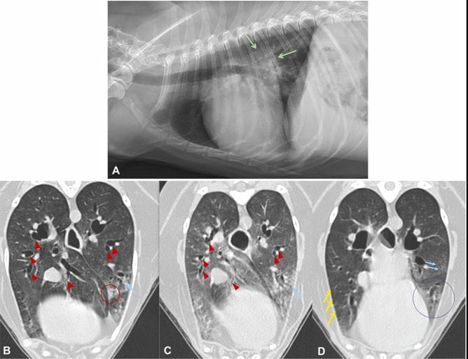 A-D. An example of multiple CT patterns and subpatterns identified in a 14-year-old female mixed breed dog, presenting for increased respiratory rate. The patient had been previously diagnosed with mitral and tricuspid valvular degeneration and was taking twice daily furosemide; an echocardiogram performed the same day as these images showed stable ACVIM Stage B2 degenerative valve disease. A) Right lateral thoracic radiograph depicting mild, caudally distributed unstructured interstitial pattern (arrows). Images B) and C) represent transverse inspiratory and expiratory images, respectively, at the level of the cardiac apex. There is moderate-marked collapse of the segmental and subsegmental airways diagnostic for bronchomalacia (red arrowheads, C), a region of consolidation within the left caudal lung lobe (red circle, image B), and peribronchovascular thickening (blue arrows, B, C, and D). D) A transverse inspiratory image slightly cranial to (B) and (C) illustrates a region of ground-glass opacity within the cranial subsegment of left cranial lung lobe (purple circle) and peribronchovascular thickening in the left caudal lung lobe (blue arrows). Subpleural interstitial thickening is present in the right middle lung lobe (yellow arrows).