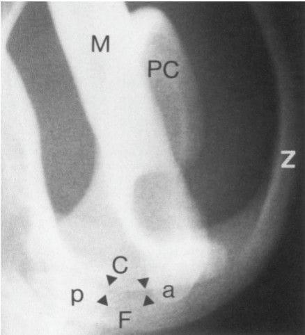Dorsoventral radiograph of the normal left temporomandibularjoint of an 11-month-old Staffordshire bullterrier. Notice the zygomaticarch ( Z ) ,the,fo.ssu mandibularis (F) and the processus retrourticuluris ( p )of the temporal bone, and the cuput mandibulue (C), processus coronoi-deus (PC) and processus angularis (a) of the mandible (M) and the thin,radiolucent temporomandibular joint space (between arrowheads